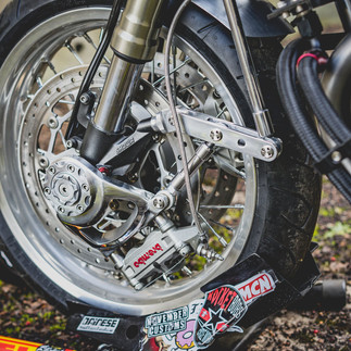 眼尖的朋友或許已經發現,這部車的前輪煞車結構非常特殊,而且還多了許多未曾見過的複雜連趕。這是因為基於性能層面的考量,November Customs特別為這部車設計出一套具有防俯特性的浮動式卡鉗架。這套設計是為了讓卡鉗能夠獨立於前叉之外,而且固定架其實是從輪軸延伸而出,因此在急煞時可以有效抑制車頭劇烈下沉,進而改善加減速時容易出現的動態穩定性變化。