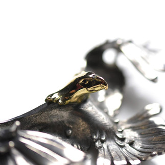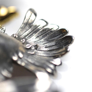 Eagle和Feather是這次商品最重要的兩個創作主題,非常具有重量感和魄力的老鷹,除了是以展開雙翅的造型來呈現,在鷹頭部份還加入了18K金的華麗點綴,而且從鷹頭、應爪到羽翼上的每一道紋路,都是透過非常精緻的雕工才製作完成。