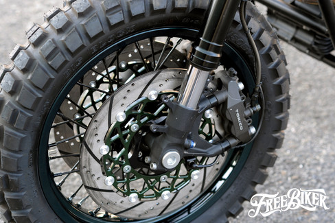 SMF表示,為了讓外型更具現代感,同時還必須真正助益於操控性,這部車從設計階段開始就決定為後懸吊變更成附連趕的單避震形式。因此SMF特別找來一組鋁合金切削的搖臂,之後再向Gears Racing訂製一支從長度、磅數到阻尼都完全匹配這部車的氣壓減震筒。前後輪雖然是使用鋼絲框設定,但是具備雙碟的前輪轂卻是屬於切削製品,輪圈亦升級成前3.5、後4.25的寬度,因此在配上130/80-17、150/70-17的巧克力胎後,自然也就為整體烘托出一股來勢洶洶的好戰氣息!