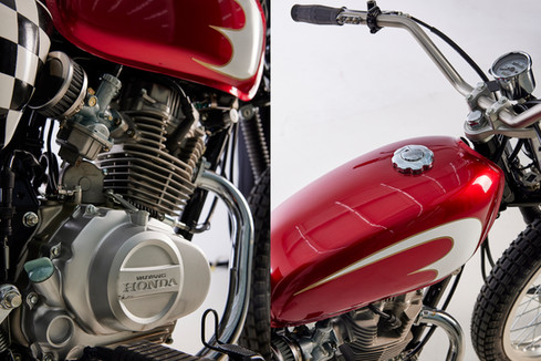 這部CG125的改裝手法算是非常定番,由於車主想要的就是Brat Style風格,因此Kicker Garage先是為前後鋼絲圈改為19、18吋配置,油箱也從CB100流用而來,再重新為副車架末端製作出圓管U字結構,因而也凸顯出座墊刻意縮短與造型更圓潤的側蓋的存在感。把手、頭尾燈、土除和排氣管亦都換上更具老味的汎用產品。